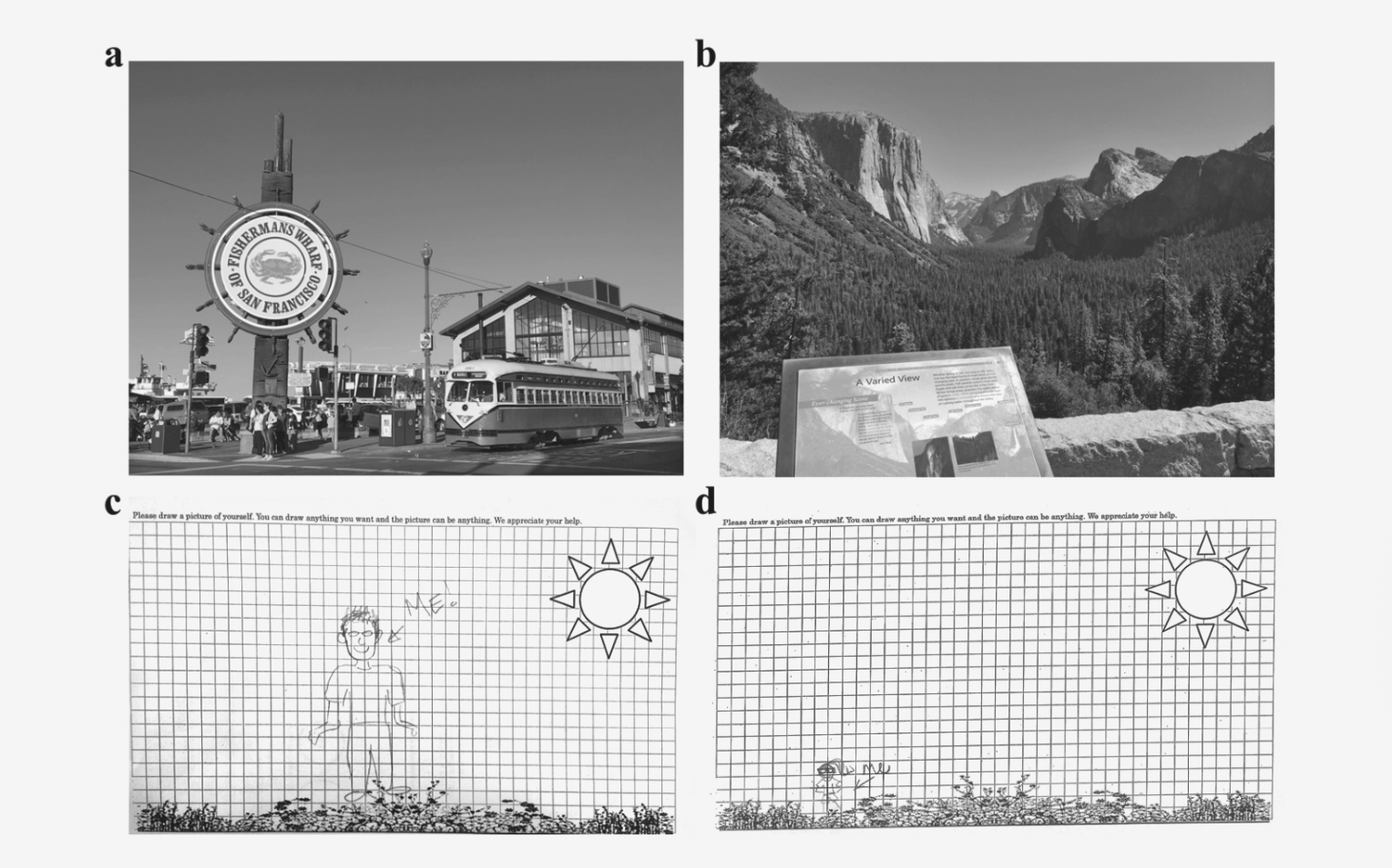 Awe creates a "small self." Keltner’s team asked people in two locations, Fisherman’s Wharf in San Francisco and Yosemite, to draw images of themselves in the world. Here’s what happened:
